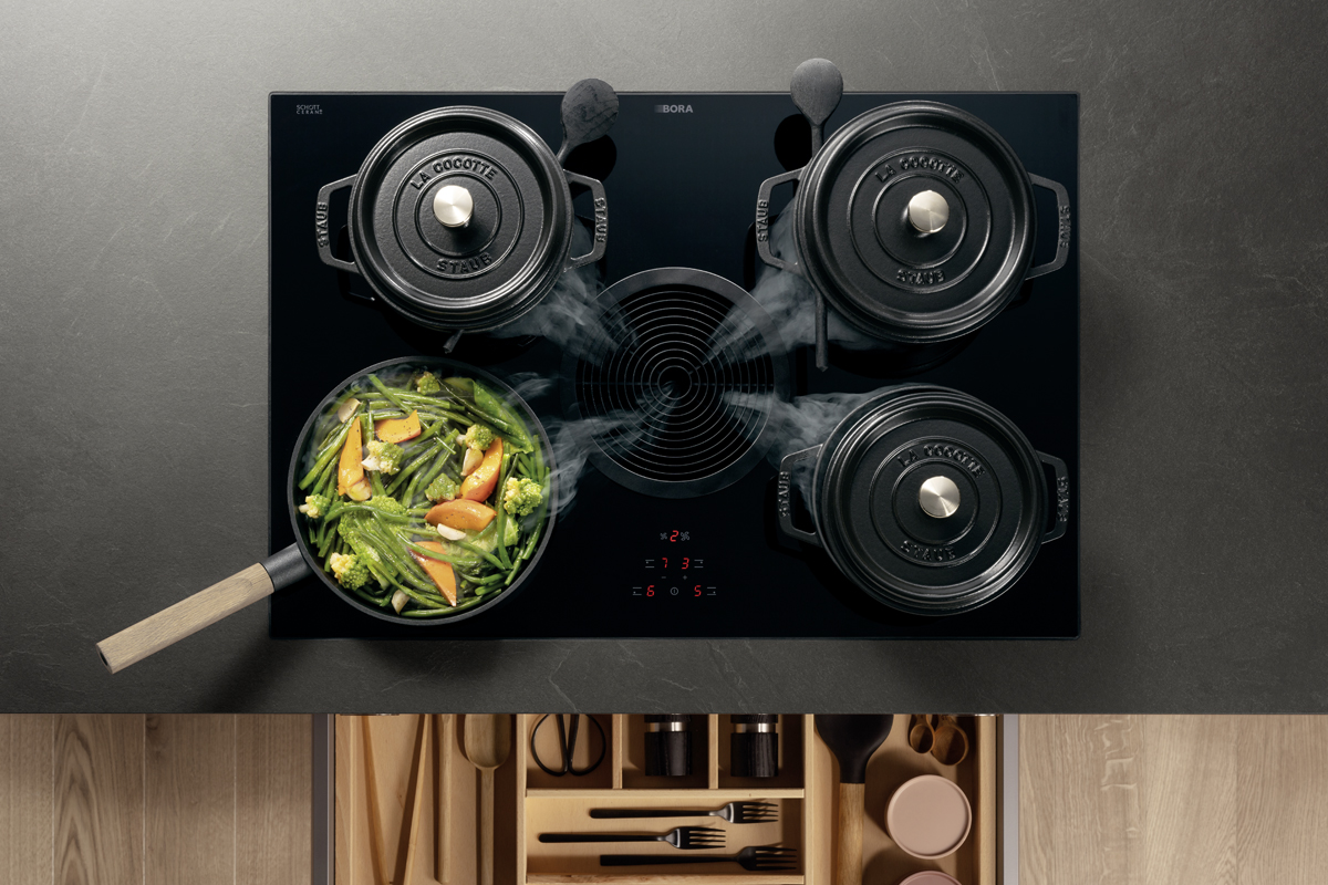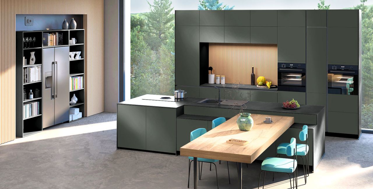 Inclusief 2x inbouwoven zwart Bosch HBG5780B6 Energieklasse A, keramische kookplaat met inductie en werkbladafzuiging (circulatielucht) Bora GP4U, side-by-side koelkast Siemens KA93GAIEP Energieklasse E, volledig geïntegreerde vaatwasmachine Bosch SMV2ITX22E Energieklasse E, inbouw-designspoelbak Elleci Logik 300XL-kasten, hoge kastplanken, eethoek, apothekerskast.