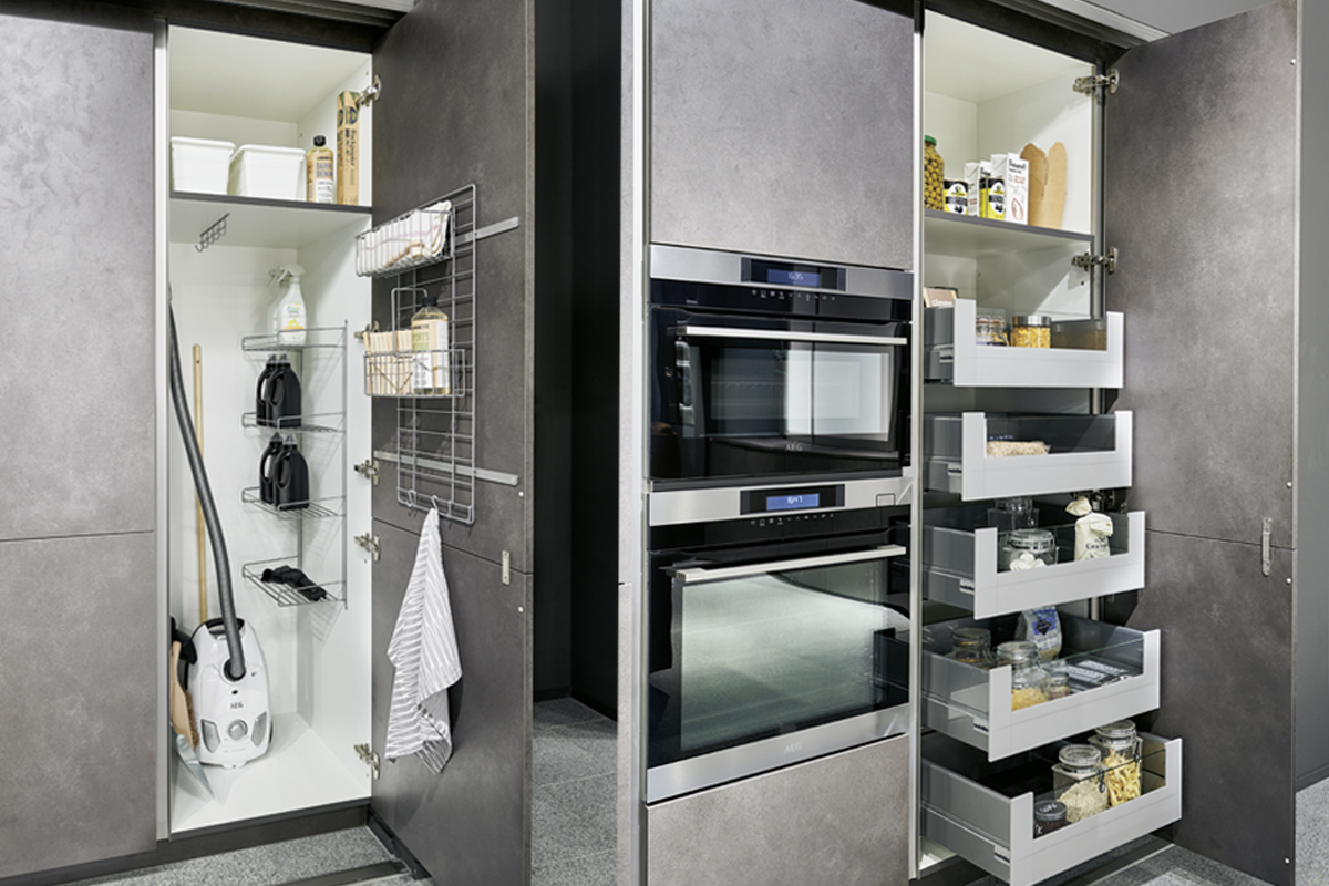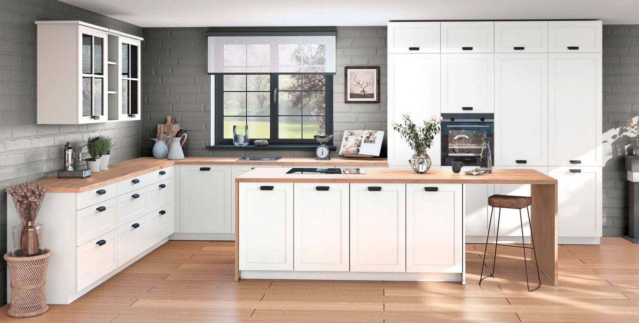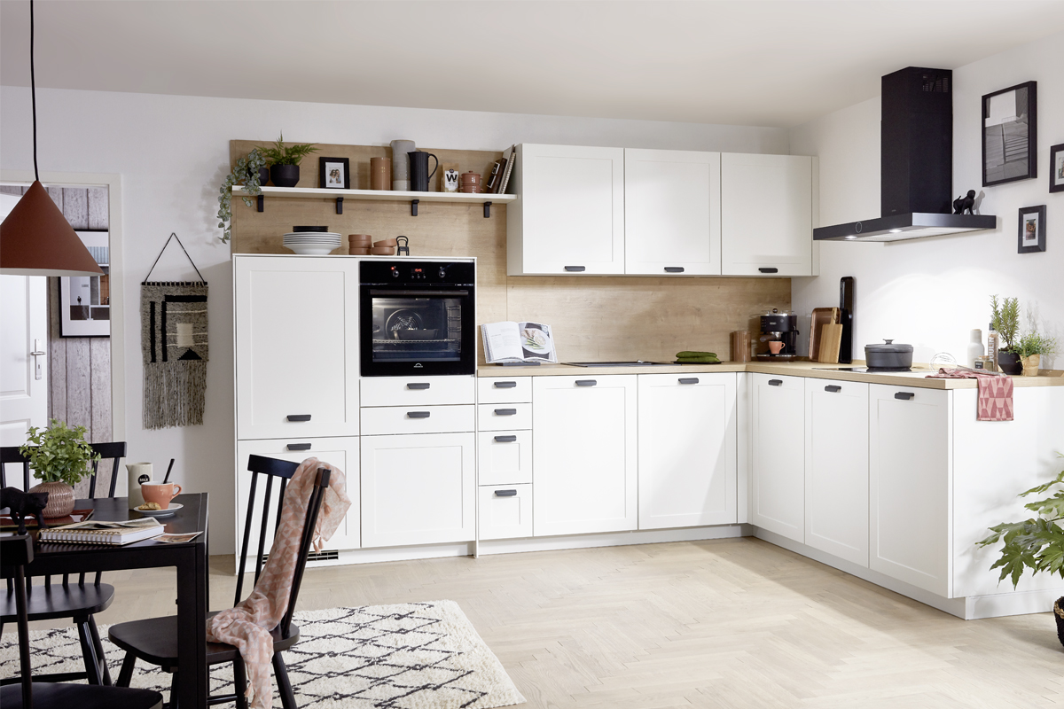 Inclusief RVS-inbouwoven Siemens HB510ABR1 Energieklasse A, keramische kookplaat met inductie en werkbladafzuiging (circulatielucht) Bora GP4U, koelkast Laurus LKG88E Energieklasse E, volledig geïntegreerde vaatwasmachine Laurus LSV60-4 Energieklasse E, inbouw-designspoelbak Elleci Logik 300, onderkasten met frontladen, wandkasten met glaspaneeldeuren, wand-schappenkast, eethoek, XL-kasten.